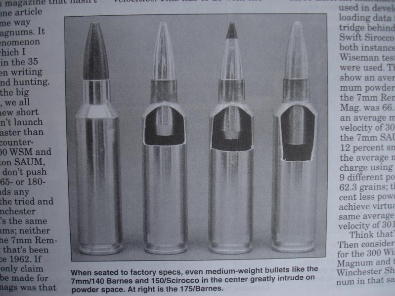 Es que yo creo que el calibre intermedio, con balas apropiadas de velocidad media, es lo ideal. A veces usar una bala pesada no es una ventaja: En España no le veo ventajas a las de 220 grains del .30 (30-06, 300 Wea,y WM,)sobre las de 180 grains. Si lo que se tirara aquí fueran Alces u osos, me callo, pero jabalíes con una media de 40 -45 Kilos, como que no lo veo necesario.Por otra parte, en cartuchos como el .300 WSM, lo corto del cuello y del C.O.A.L.y de la garganta del rifle (freebore), hacen que si le metes un proyectil de mas de 180 (No digamos los Barnes, que son mas largos a igualdad de peso), el culo de la bala entra hasta la mitad del casquillo, y roba espacio a la pólvora.