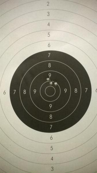 El primer disparo en banco, realizado a 50mts lo puse dentro del 10 rozando un poco la línea que separa del 9. Cuando lo fui a ver quedé asombrado ya que, en la armería solo lo habían colimado -como les dije-. Disparé el siguiente y igual pero rozando la línea del 9 -dentro del 10- por la parte baja. Pasé a 100mts y después de ver un impacto por debajo y un pelín a la derecha entre el 8 y 9 le di elevación para dejarlo a 4cmts por encima y me pase...quedando a 12cmts por encima y un poco a la derecha. Este miércoles rectificaré este pequeño error.