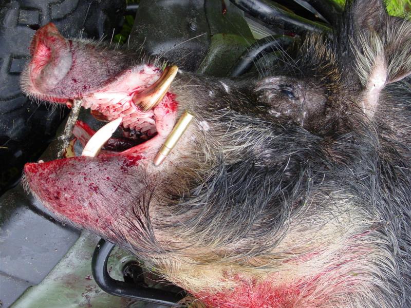 Por aca en La Florida, lo que tenemos son cerdos ferales y no Jabalies Europeos. De todas formas algunos crecen hasta tamanos enormes, en exceso de los 100 Kilos. Los cazamos con perros en la finca ya que destrozan el terreno y son una plaga.