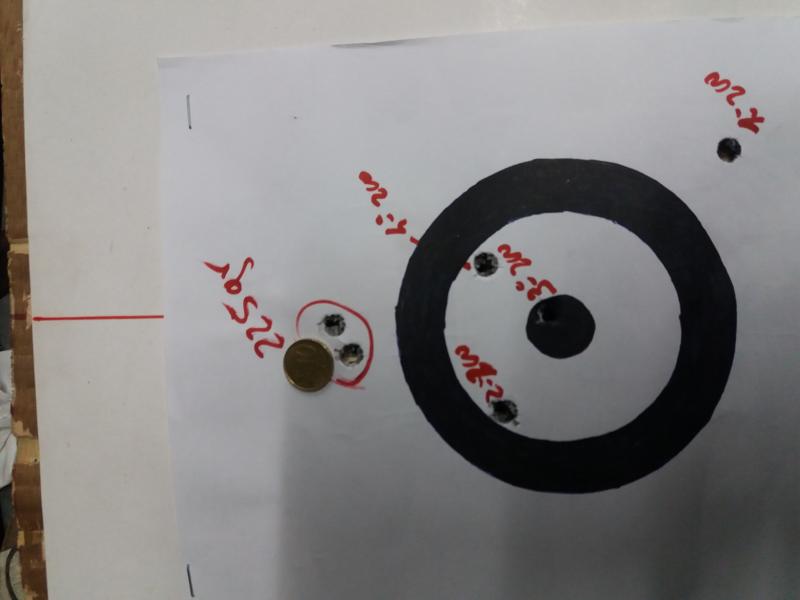 En esta foto se pueden ver los dos gupos, empecé disparando las de 200 y al ver el relativo desastre dispare dos de 225 que es con las que tenia centrado el rifle a 200 metros,por eso pegan tan altas,para asegurarme de que no había ningun problema ni de apoyo ni de visor etc. Curiosamente las mas ligeras pegan mas abajo. Esta tirada es 100