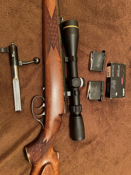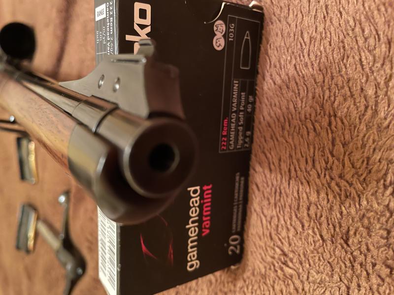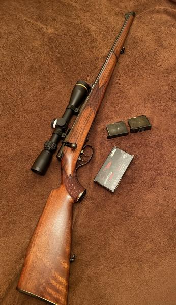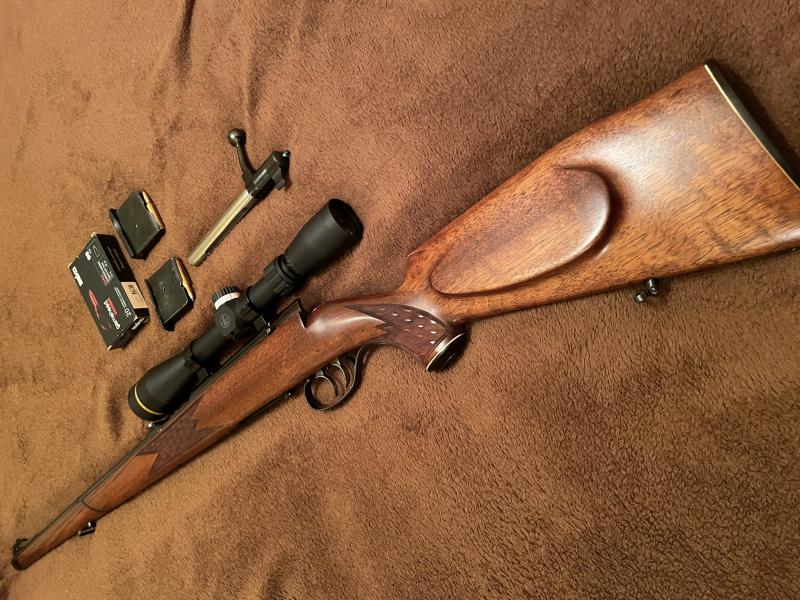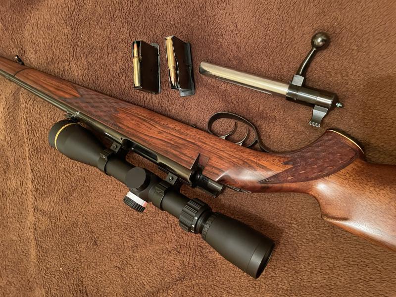 Se ha restaurado tornillo a tornillo, pulido y pavonado de toda la piezeria, se ha respetado el pavon original que están muy bien de caño y acción, maderas al aceite, afinado del pelo disparador (Segundo gatillo) ,recentrado percutor,cambio uña y muelle extractor, pulido del cerrojo, restaurar el cargador original y buscar uno nuevo, ha sido todo un reto. etc.en fin !. Un capricho que me ha salido caro al final, pero que deja un arma dificil de encontrar hoy en día. Se le ha montado un visor Leupold 4-12x40 con torreta y reticula tmr. Visor de 360 gramos de peso y muy compacto, que le va perfecto debido al pequeño tamaño del rifle. Ahora con sako varmint de 40 grains a 1.060