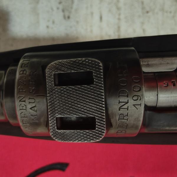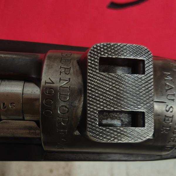En principio no parece original, el marcaje del puente delantero, no el cañón, no se corresponde con los de Oberndorf, y salva justo el fresado para la base de las monturas, que tampoco se usan en esa época , los visores se empiezan a montar en armas civiles algo después de la Primera Guerra Mundial.