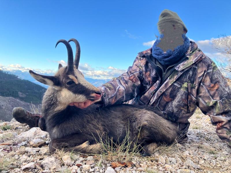 En ese instante Thomas nos dijo que nos mantuviéramos en silencio, pues había otros dos animales algo más cerca, a 285 metros, cogió el catalejo y constatamos que uno era una hembra vieja, sin crías y con una cuerna muy abierta y bonita. Decidimos intentar el tiro busqué un buen apoyo cuerpo a tierra con el bípode, lo tenía en la cruz, pero estaba de pecho, soplaba viento, un valle se extendía entre la rebeca y nosotros, pudiendo provocar un efecto túnel que desplazar el proyectil fuera del objetivo. Esperamos a que se cruzara, los minutos se hicieron eternos, la vista se me cansaba, deje de mirar por el visor, mi cuerpo se iba resbalando ladera abajo, los dedos estaban entumecidos, por fin se empezó a ladear y sin pensármelo aprete en gatillo … la rebeca cayo muerta.