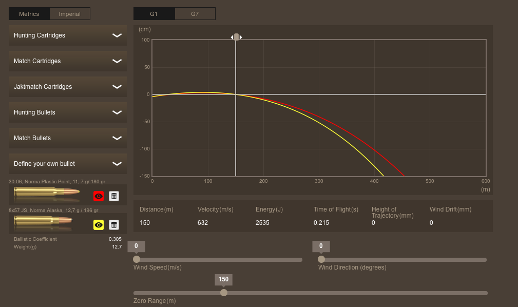 En esta foto del programa balístico de Norma tienes el 30-06 con 180 grains Plastic Point y el 8x57 con 196 grains Alaska (que son las balas que yo emplearía). Esas son las diferencias en cuanto a rasante (pincha para ampliar la imagen).