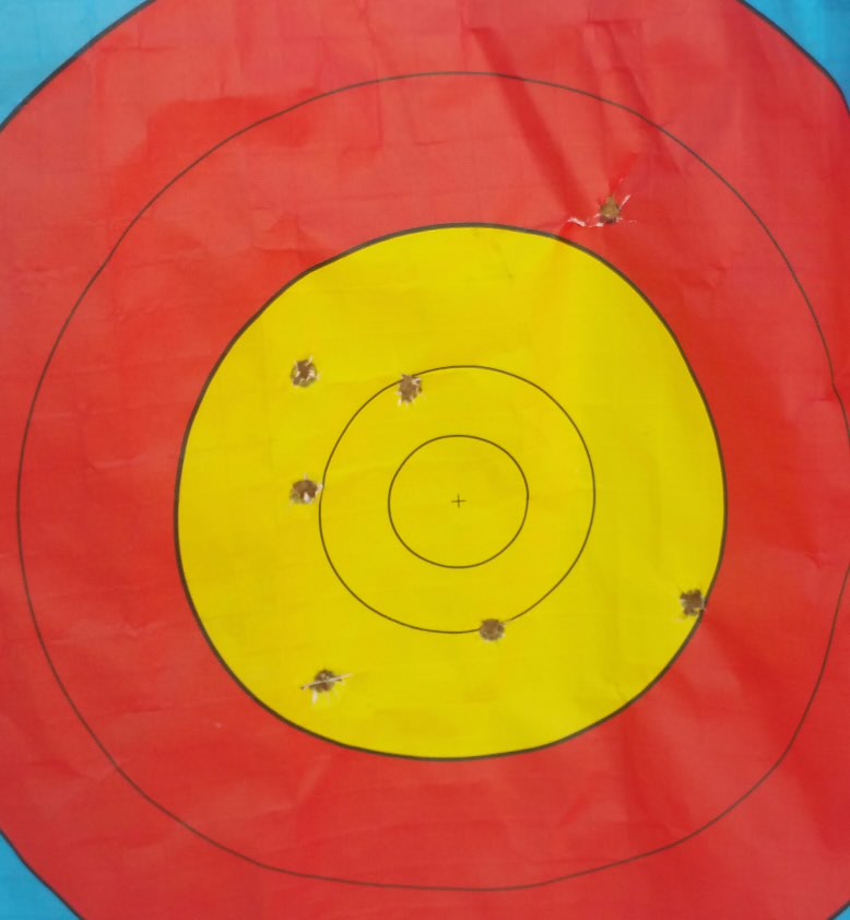 Tercer tiro:....... Sorpresa.... justo en la vertical del 0 de la diana, tres centímetros alto.
