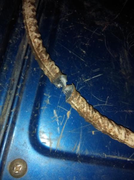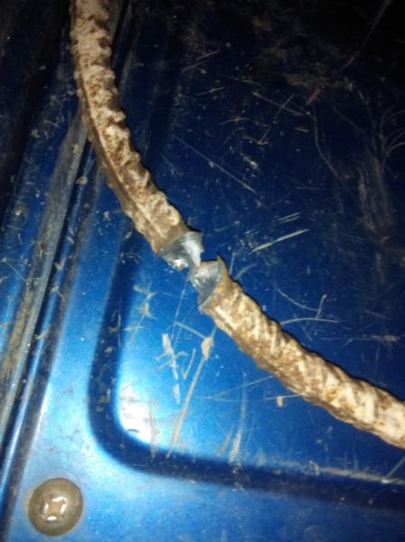 Segunda conclusión, y también con sorpresa: La bala que fue al centro, alcanzo de lleno la barra de hierro a la que estaba atada la diana, y LA ATRAVESO LIMPIAMENTE (os pongo las fotos debajo). El efecto sobre el hierro es como si lo hubiese fundido, como si le hubiésemos aplicado soldadura a una potencia superior a la que resiste. ( he hecho muchos agujeros en hierro con la eléctrica de soldar electrodos). Esto me hace pensar que la SST de 180 es una punta mas dura de lo que parece, y eso de que si toca una ramita se puede desintegrar, pues cuentos chinos... por lo menos a la velocidad de un 30.06. (que según mi opinión no es poca)