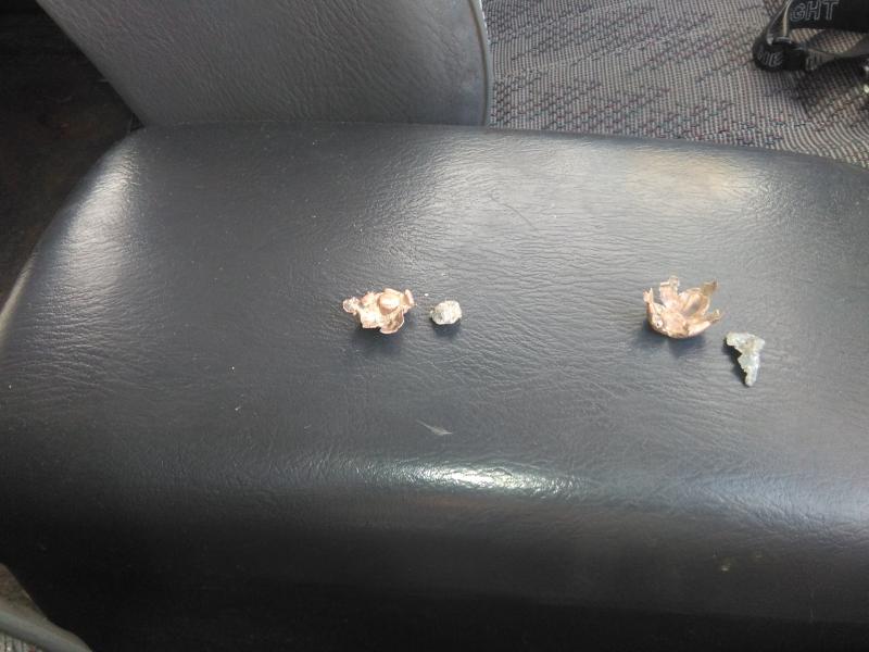 Tercera conclusión: Recuperé las dos puntas que no tocaron el hierro, metidas en la tierra, y están totalmente espachurradas, pero conservan la envuelta y el plomo unidos, aunque forzándolas un pelín las separé sin problema.
