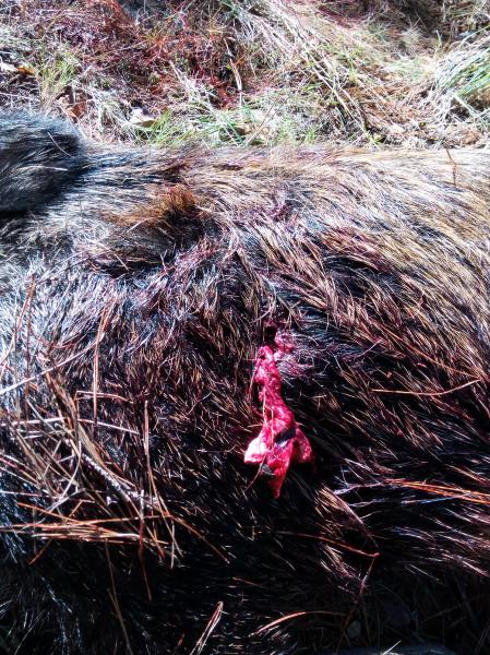El disparo entro un poco alto a la altura de la columna, saliendo por la pata trasera del lado contrario a la altura de la parte alta del pernil.