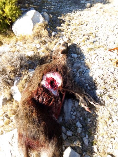 El animal un machete joven devia de estar por los 30 kg, llegava con tensión acosado por los perros y despues de oir los disparos de puestos continuos.