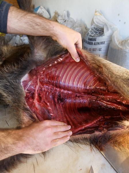 En este ultimo al llegar al animal, me sorprendio no encontrar salida de la bala. No nos dimos cuenta hasta que lo pelamos, de la trayectoria del mismo y hasta que me di cuenta de la situacion real pense que la columna habia desviado la trayectoria del proyectil hacia la pata trasera. Pero a juzgar por las salidas de otros impactos, entiendo que el tiro paso al animal cruzado y de forma longitudinal.