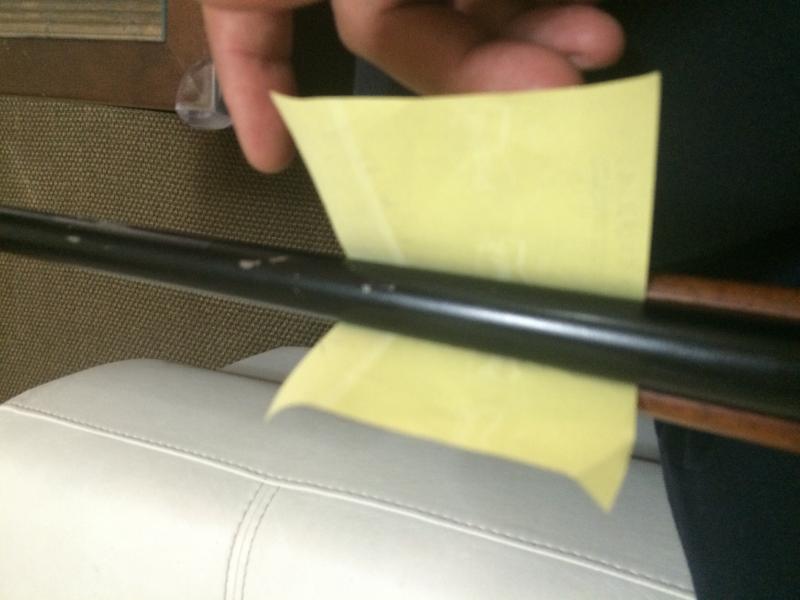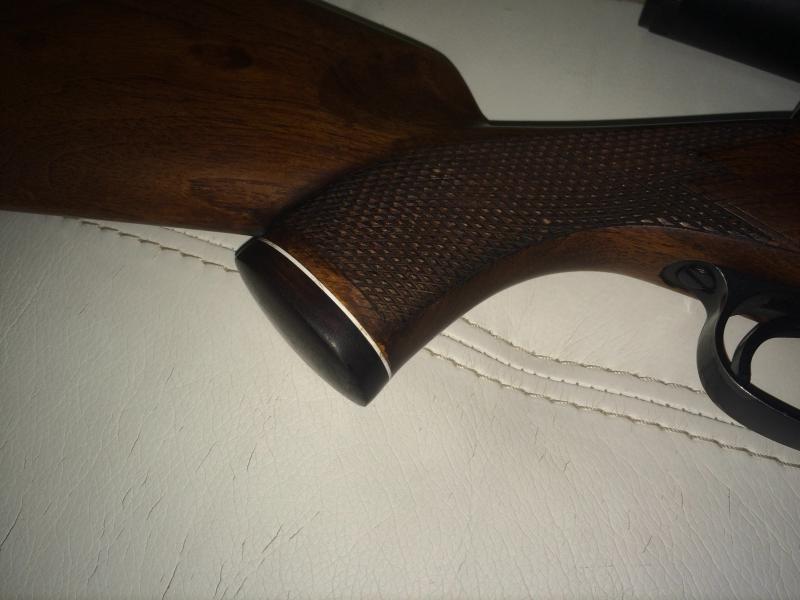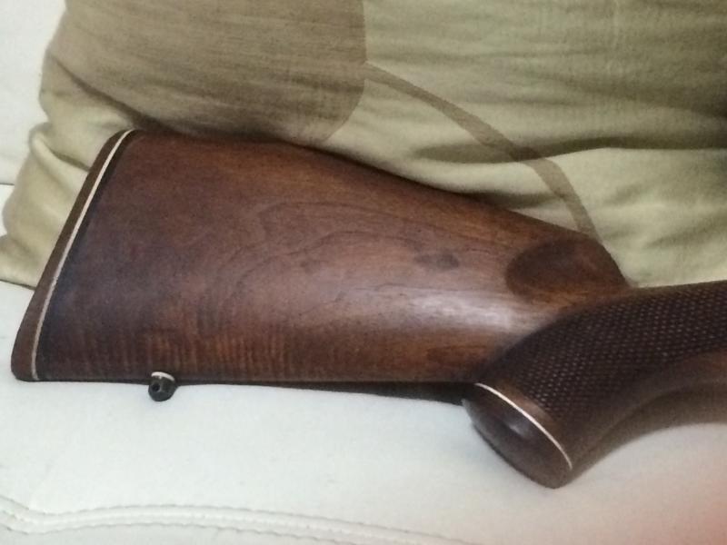 Tenía el nombre de su anterior dueño pintado y barnizado (muy bien, por cierto), se lo lleve al armero para que lo quitara y me hizo las maderas para igualarlas, creo que las laco.