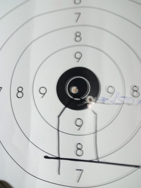 Teniendo en cuenta que se centró un visor de 6x, fijo, de retícula alemana, y que el poste tapaba, más o menos lo que se dibujó en el blanco, la cosa deja bien clara la precisión del calibre y del rifle. La distancia 150 mts.