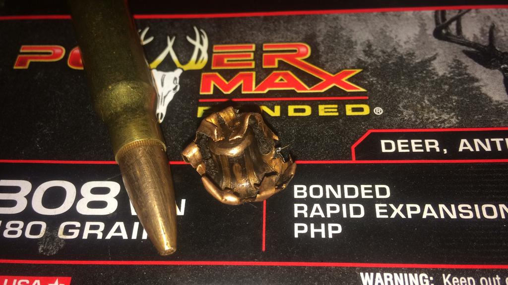 Si te gusta la Power Point, por qué no la Power Max de 180 grains? Yo cambié a ella también por causa de no marcar el plomo, ya que lleva el proyectil encamisado hasta la punta, hueca. Sus efectos son muy parecidos, y no es bala dura. Expande muy bien incluso a poca velocidad. Desconozco los efectos en un mágnum, ya que yo la tiro en un 308 W con cañón muy corto. Expande igual de bien que las Core Lock pero mantiene las puntas íntegras y también retiene bien el plomo al impacto, formando no una seta, si no más bien un cuchurucho de helado derretido.