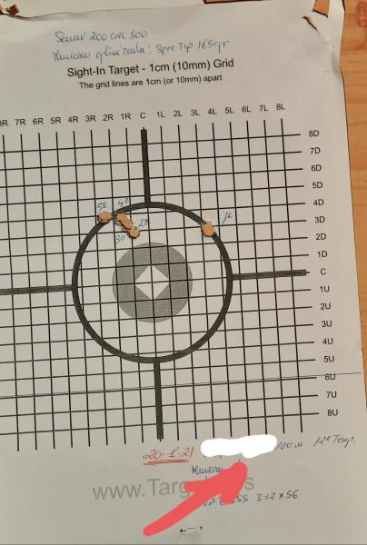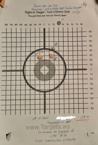 Te paso unas fotos que he encontrado de dos blancos de mi Sauer 200 recuerdo que lo que hice fue corregir los disparos el primero se va fuera corrijo baja a la derecha y hago dos disparos corrijo y se van a la izquierda un poco pasados otros dos pero veras que agrupan muy bien si sigo disparando sin corregir el visor lo pongo abajo de la diana, no hice mas porque el visor Swarovski solo era de prueba y dejaría el Zeiss que es la segunda diana, es el que mas utilizo para cambiar cuando vaya de rececho con el Swarovski de mas aumentos...