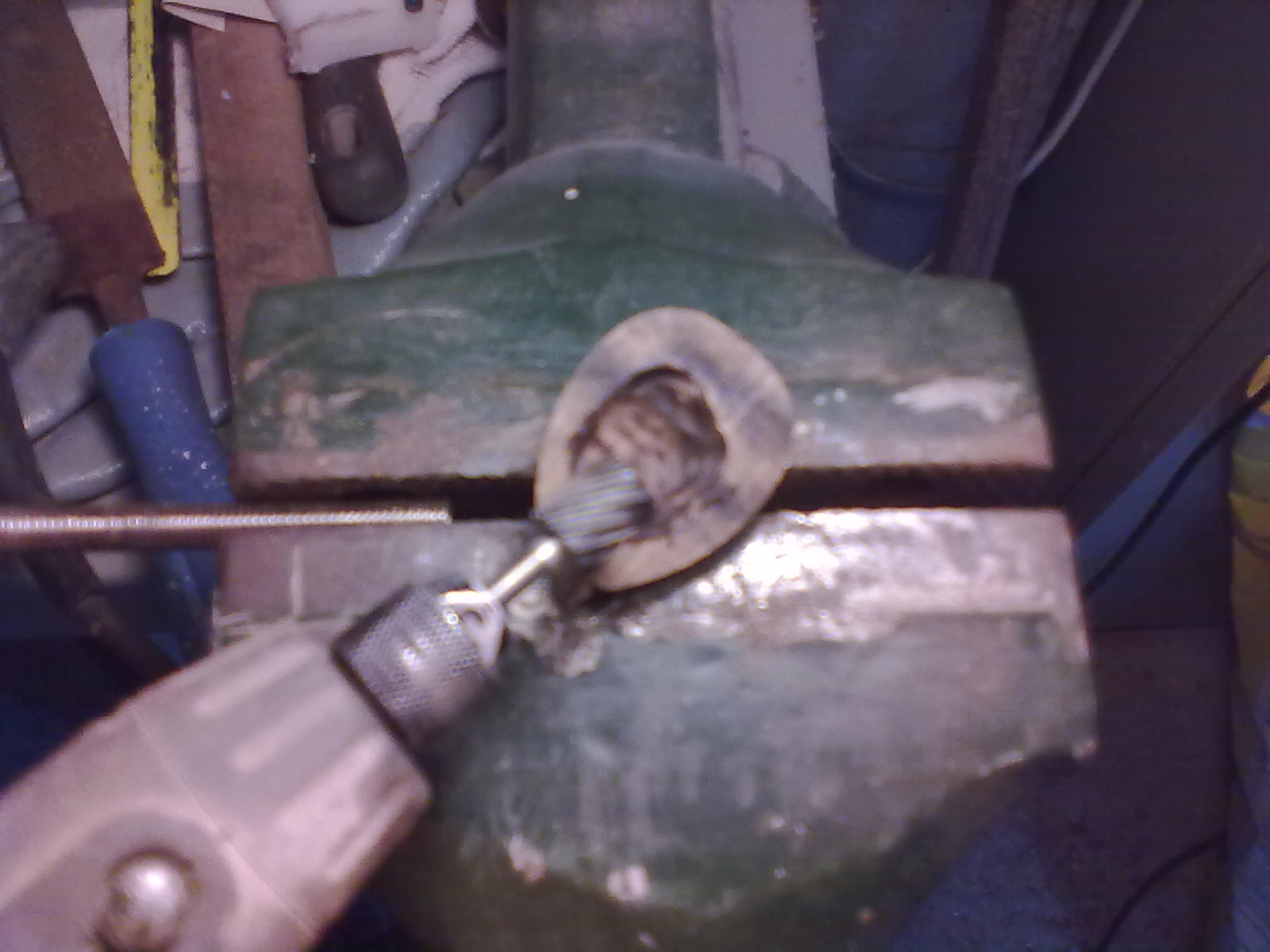 Un truco, yo usé un taladro para tornear la pieza, hice un pequeño agujero en el taco de madera con una broca de 6mm sin que llegase a salir por el otro lado y metí por él una varilla de hierro también de 6mm con un poco de epoxi, esperé a que secase y apreté la varilla dentro del taladro y sujeté el taladro en un torno de taller, después fue cosa de tiempo, lima y por último lija. Posteriormente se calienta la varilla con un soplete y se suelta fácilmente de la madera (el epoxi se ablanda), se corta en dos con una sierra de hierro se hace el vaciado con una Dremel o similar y se asientan las dos caras con una hoja de lija sobre una superficie plana, se pegan alrededor de la bola y después se les da un poco de aceite para maderas (made in Roberto)