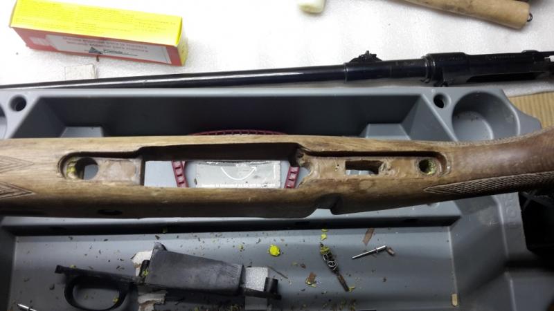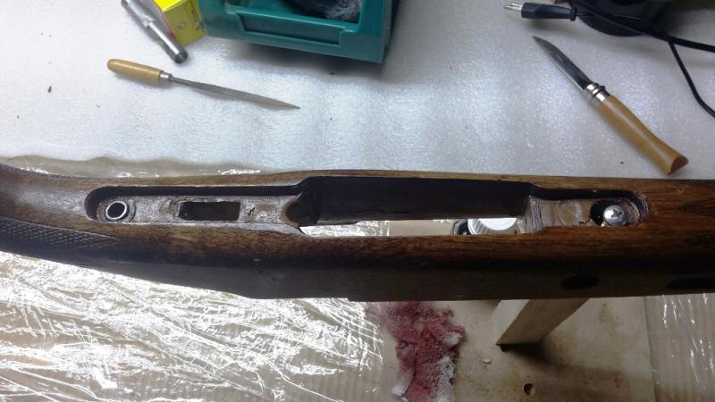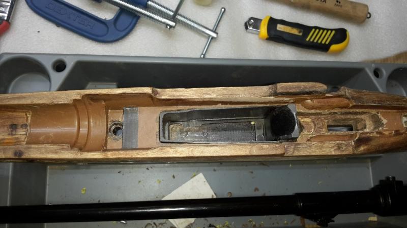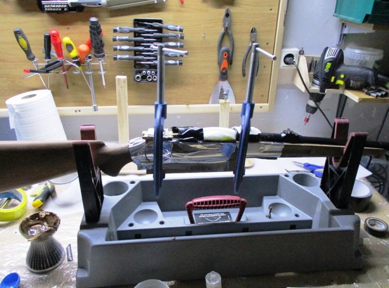 No he podido fotografiar el proceso de preparación de las resinas y tratamiento del metal para que no se pegue porque estaba solo y las manos la tenía ocupadas, así que he fotografiado el final, con conjunto acción/cañón ya fijado sobre la caja de la culata con la resina ya puesta. Ahora hay que esperar 24 horas para ver como ha quedado el encamado y dar los repasos a las rebabas que hayan podido quedar y limpiar, antes de encamar por debajo que será mucho más sencillo