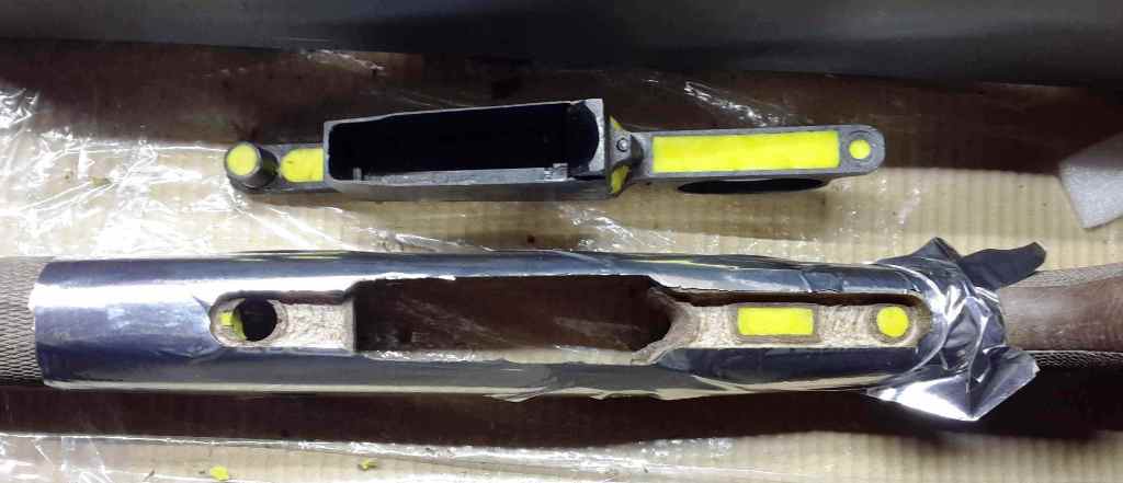 -ASÍ QUEDAN LA ACCIÓN Y LA CULATA CON LOS RELLENOS DE PLASTILINA PARA RECIBIR LA RESINA A FALTA DE DARLE A LOS HIERROS CON EL PRODUCTO DESMOLDEANTE PARA QUE NO SE PEGUE EL EPOXI AL METAL.
