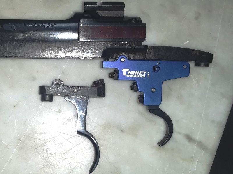 Bueno, la faena final a mi Modelo Coruña A ha sido poner un gatillo Timney y regularselo a 3 libras=1'36kp (me estaba dando 5'8 libras=2'63Kp). La instalación no es cambiar uno por otro sin más, como se ve en la foto tienen diferente perfil por lo que he tenido que modificar la madera otra vez con la fresa del minitaladro. Ha sido fácil comparado con lo anterior.