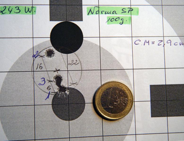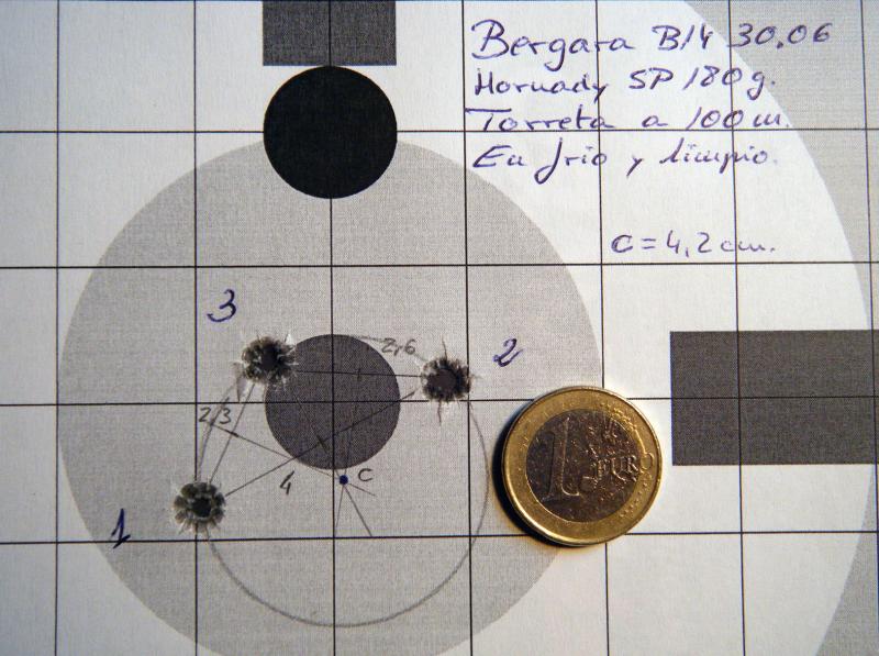 Conclusión: la munición empleada no es precisamente una munición para lograr grandes agrupaciones pero con las agrupaciones logradas funciona perfectamente en caza. Creo que al estar el cañón todavía en rodaje las agrupaciones pueden mejorar bastante al terminarla. Posiblemente con municiones con punta de plástico tipo Hornady SST o similares pueden mejorar una vez hecho el rodaje del cañón. La duda está en con qué peso de punta irá mejor, en 180 o 165 g.