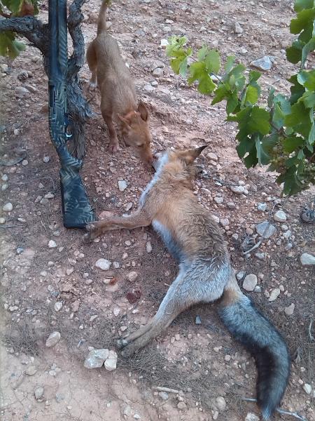 Hemos salido tarde 18:00 y con prisas pero estábamos casi seguros de que las zorreras a visitar darian su fruto. Llegamos a la primera que raramente nos falla pero hoy no ha sido asi, salimos rapido a la siguiente que esta cerca y no hacemos mas que soltar las perras y se meten sin pensarlo ( buena señal ) despues de salir dos veces en 20 minutos y sin escuchar nada y tras una media hora sale un conejo de una de las bocas de la zorrera, se me queda mirando y le perdono la vida. Cuando ya estábamos desanimados pues cuando no escuchas nada te vas desanimando poco a poco, sale el primero de los zorros
