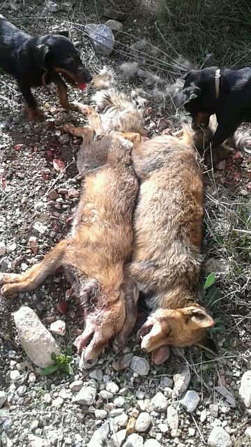 Hoy seguimos con ellas, despues de una mañana de perdices hemos salido a las zorras y han caido tres, dos de los compañeros y nosotros nos hemos pasado mas de dos horas esperando a que salieran las perras que han matado una zorra dentro.