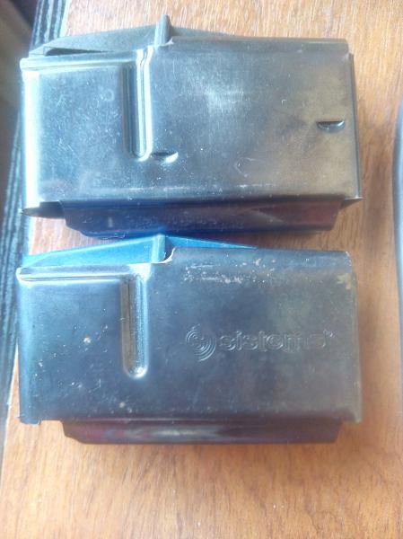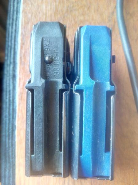 El de la teja azul es "la imitacion" y el de la teja negra el que venia con el rifle, como puedes observar el original y la imitacion son hechos en Italia, y el muelle elevador cambia de uno a otro... que por cierto la Imitacion, no alimenta bien el rifle si el muelle no esta completamente asegurado detras de la muesca