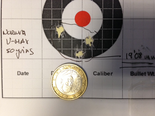 Segunda serie con Norma V-max 50 grains, tras dejar enfriar 5 minutos, es un poco mas "dispersa".