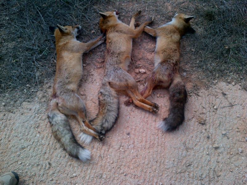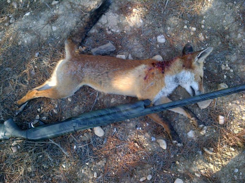 os cuento la historia que llevo a este animalico a tener el craneo en una peana. Había salido dos noches al jabalí y maese raposo siempre cruzaba a la misma hora con su pareja mientras yo les perdonaba la vida a pesar de haber mas zorros en mi coto que cualquier pieza de caza menor. La tercera tarde sabía que los guarros no iban a entrar y me fui al zorro. Yo estaba subido en un arbol y tenia la charca a 15 metros delante de mi. Entró de frente, dejando a su izquierda la charca, cuando pasaba por el pino donde yo estaba la tiré sin verla, calculando la velocidad a la que iba porque si aguantaba mas no hubiese podido tirarle. Tengo un buen recuerdo de esa espera, los que esteis acostumbrados a cazar direis, pues menuda cosa... pero para mi era la primera zorra, la primera pieza en espera, y le tengo cariño ^^