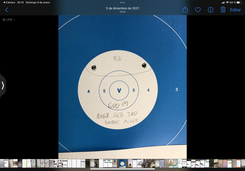 Buenas noches. Segunda foto, 600 metros.8x68, Recarga con RS70, vaina RWS, pistón cci250, Vi 925m/sg, 5 grados, punta Acubond 200g.Col 90,2.