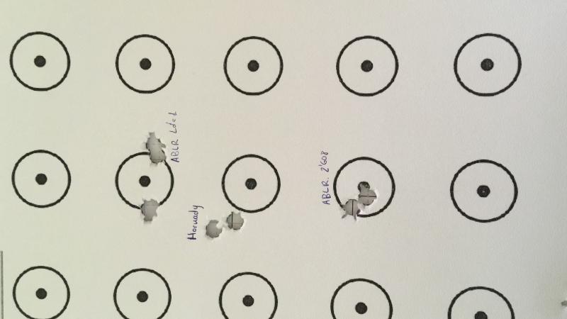 y las Sako Hammerhead grupo de 5, los otros tres fueron correcciones en clicks el de mas abajo fué el primero de todos y me fuí llevando el grupo arriba, por el camino comprobé agrupacion de 5 y fui buscando el centro de la diana, pero me pasé dando clicks a izquierda o la dispersión natural del proyectil..