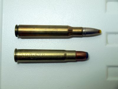 Casi había olvidado mi promesa de poner la foto del 9x57 que tengo en la colección. Más que nada por ilustrar (todo letra es un poco rollo. Ahí van dos: una suelta y otra comparado con el más maravilloso calibre jamás inventado (no hace falta que diga cual