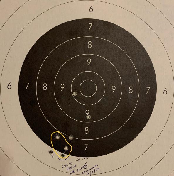 Buenas tardes. Tiros en banco de tiro a 75 metros (es una distancia rara, lo sé, pero era lo que se podía por circunstancias). La agrupación del centro es geco soft point de 140 grains. La de abajo es norma PP punta amarilla de 150 grains, y curiosamente es con la que se hizo la puesta a tiro.