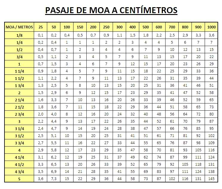 La tabla está muy bien. Para el que no la tenga a mano le basta con saber que, redondeando, 1 Minuto de Ángulo (MOA) es el equivalente a 3 cms. a 100 metros.