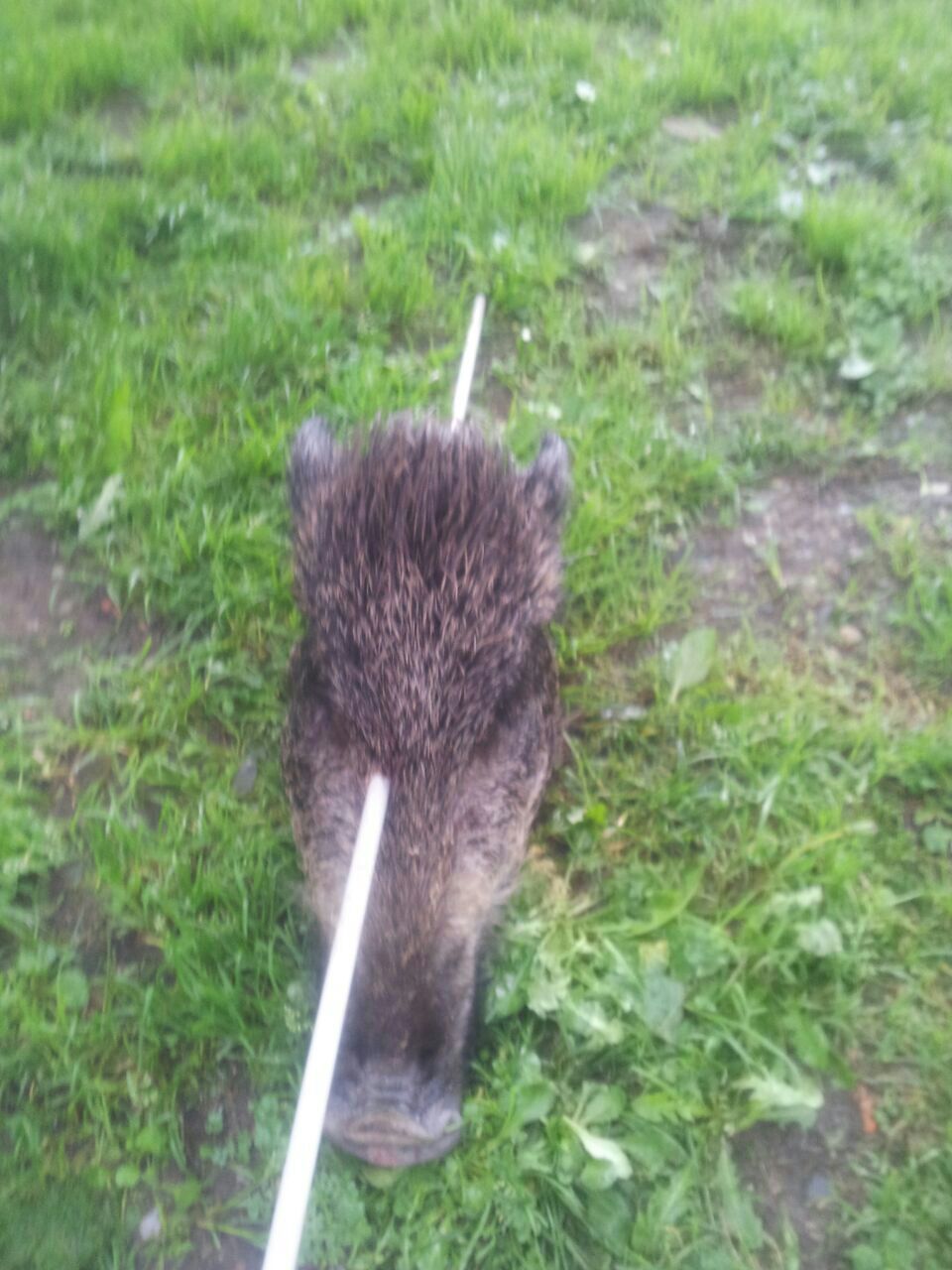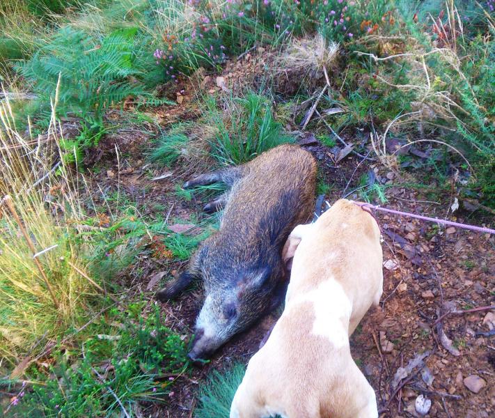 Primer tiro, a cascaporro, de arriba a abajo (yo estaba subido en un pedrusco de unos dos metros de altura para divisar algo el monte). El tiro le dio atravesado por la nariz, un poco mas abajo que el de la foto. tiro muy malo, pero que le arranco un trozo de la trompa como de tamaño de una pelota de pingpon. El cochinillo tras recibir este disparo y a pesar de venir a toda leche, no hizo otra cosa que dar vueltas en circulos de las patas traseras, con las patas delanteras en el mismo sitio. Segundo tiro, fallo ( malo que es uno) y el tercero en los codillos quedo seco.