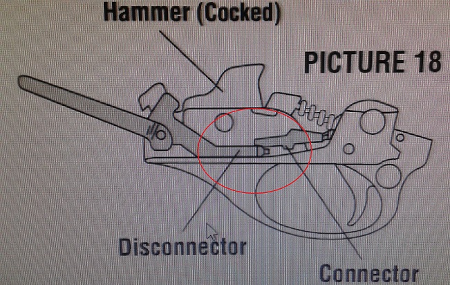 Cuando el cierre retrocede empuja al martillo hacia atrás y este debe quedar retenido por el fiador, además, el sistema de disparo incorpora un mecanismo que impide que este se suelte teniendo el gatillo apretado, y no se libera hasta que se deja de oprimir el gatillo rearmandose entonces y quedando listo para liberar el martillo al accionar de nuevo el gatillo. Si ese dispositivo no actuase el arma ametrallaria.
