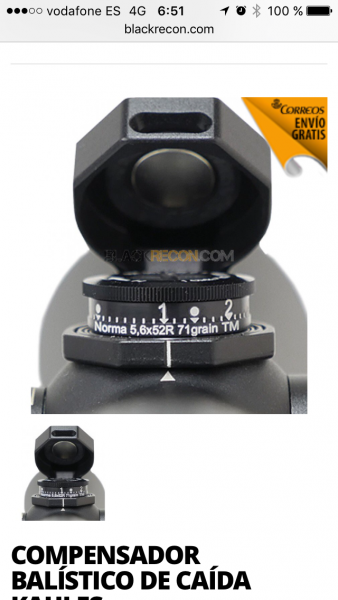 Buenas a todos, tengo un zeiss victory v8 1.8-14x50 la torreta balística me costo 260€ y la anilla especifica 50€ zeiss me pidió calibre, grains , coeficiente balístico y velocidad en boca, y hasta 200 metros va perfecta aunque me falta comprobar a 300 metros y 400 metros (si encuentro algún lugar), sea la marca que sea lo recomiendo, un saludo