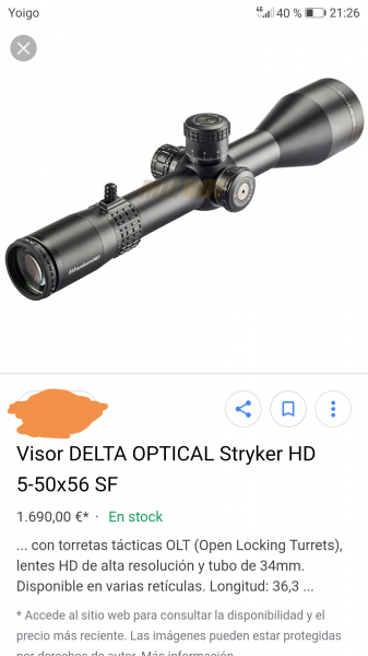 Me preguntaste por el y te mande un mp pero no se so te llegó o no,te cuento yo lo probé pero sólo para mirar por el ya no te puedo decir más,Yo lo mire para la caza de rececho y algún que otro tiro con un bergara b14 hmr que está en la armería a espera del visor,te cuento de claridad normalito igual que cualquier visor mucho más económico lo que más me chocó fueron los aumentos para sus 24 que tiene el mío que tiene 15 acerca mucho más las cosas que el Delta,al final como dicen que el dinero del pobre va dos veces a la tienda y por esperiencia también pues estoi a la espera de que llegue el swarovski x5i 5-25×56,conclusion para mi ese visor no vale los 1300 eurs,en óptica hay que comprar lo mejor que no se puede este año pues el próximo o el próximo,mi consejo que se suba de eurs para arriba o que se baje de precio para abajo