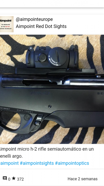 kiazara2 escribió:Hola a todos. Alguien sabria decirme como quedaria montado mas bajo un aimpoint h2 micro. En un benelli argo. Con la montura especifica de aimpoint para este rifle o con una base weaver y el aimpoint anclado con su base weaver?