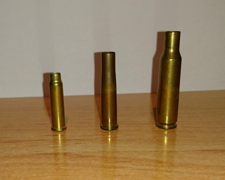Unas vainas de los tres 22 Magnum 22 Hornet y 222 Remington.