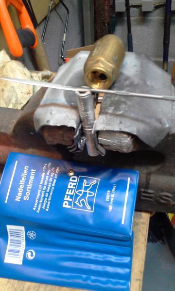 Se busca algo cuyo radio coincida con el de la parte del cajon de mecanismos de nuestro rifle, que apoyara en el pilar, en este caso pieza de laton de fontaneria.