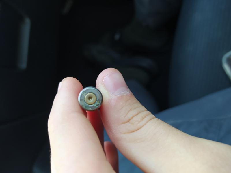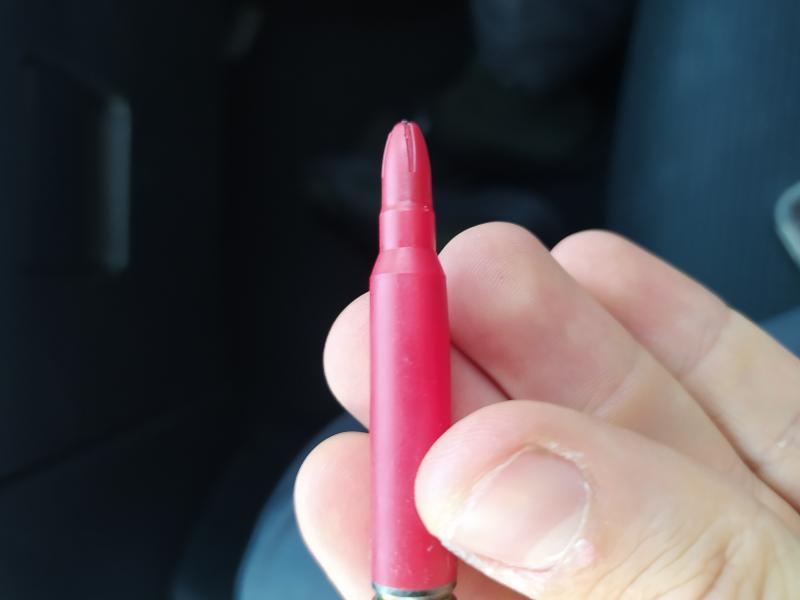 La parte del proyectil también tenía recubrimiento de plástico y por la forma y proporciones del cartucho yo diría que es un 223 Rem.