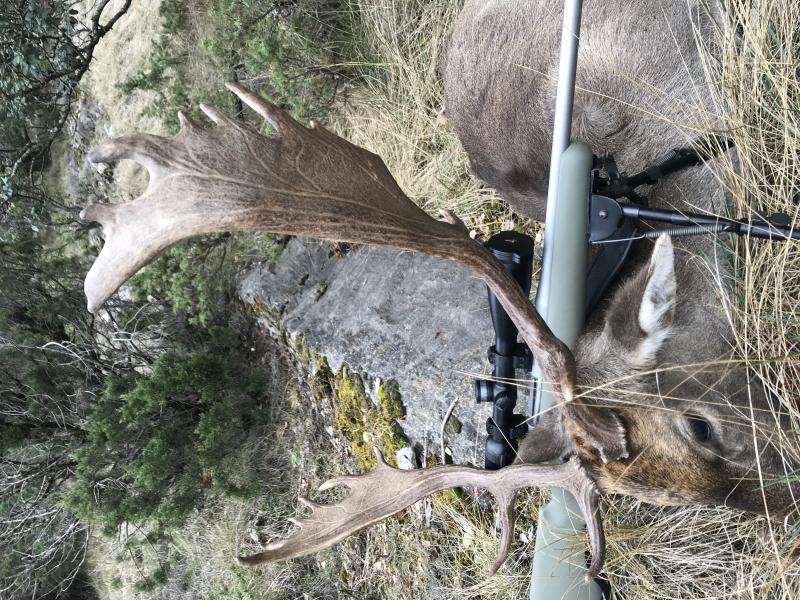 Apoyar la orquilla apuntar con un tiro hacia arriba pues iba subiendo una ladera y meter la cruz en el cuerpo del animal. Dos tiros de cerrojo seguidos, el primero le da por delante de la pata trasera, digamos de tripas atrás. El segundo falla pues no le veo apenas.