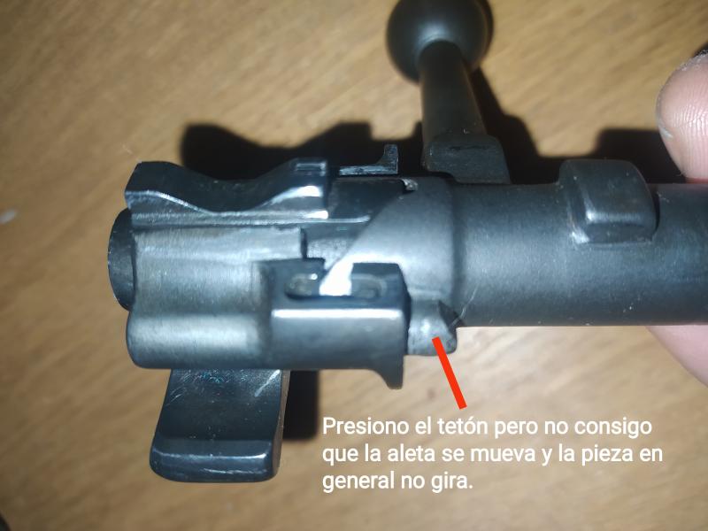 Buenos días, hace poco me guiaron un cetmeton y examinándolo con 1 amigo no se que tocamos que se quedó la aleta del cerrojo girada y no hay manera de ponerla en su posición y no se puede meter el cerrojo.. Probamos a meter el tetoncillo con muelle que tiene el cerrojo hacia adentro pero no hay manera de girarlo. Le ha pasado a alguien? Luego pongo fotos por si alguien sabe que le pasa. Gracias y saludos.