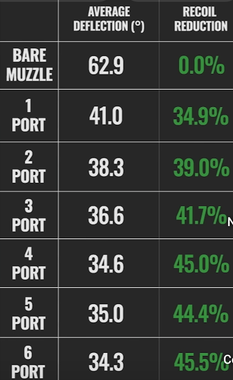 Adjunto datos de la empresa MDT sobre las pruebas que han hecho con los frenos de boca según la cantidad de orificios. Llegan a mitigar la mitad del retroceso. Como han dicho es muy importante en estos casos la protección auditiva.