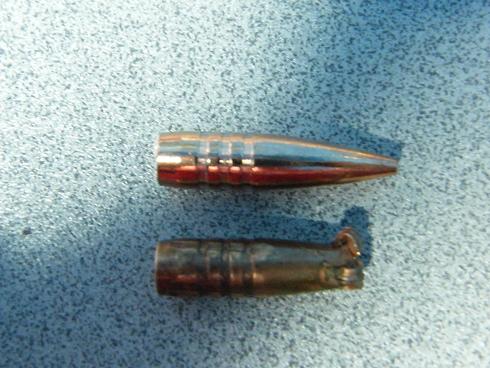 También la Sierra, pero yo usaba la misma que uso en el 30-06, la GK HPBT de 165 grs(no es la SPBT, no es un error); es una bala "rara" pero tremendamente efectiva. Sobre sto he de decir que Sierra tiene aleaciones de plomo de cuatro durezas distintas y por tanto una bala (ésta, por ejemplo) que parece tradicional retiene más peso que muchas y desde luego tanto como la Nosler AccuBond.