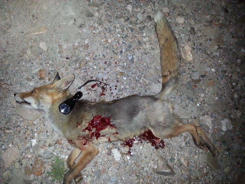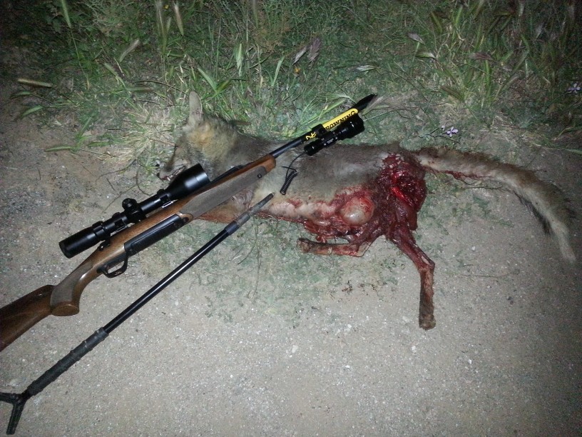 Esta tuvo la mala suerte de ser la ultima en entrar una noche de aguardo a los jabalíes. Estaba en una charca esperandolos pero me entraron tres zorras, una a las 21:40 aun con mucha luz que la perdoné la vida, la segunda entro a la media hora que hice lo mismo pero despues de un rato sin movimiento ninguno me entro esta a las 12:30 que solo la escuché beber agua y viendo la hora que hera decidí tirarle y su mala suerte el estar de culo pues el destrozo que le hizo fue asqueroso.