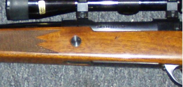 No es un botón. Es un tornillo pasante que muchos rifles con caja de madera, sobre todo de calibre magnum, llevan como medida para prevenir que ésta se raje.