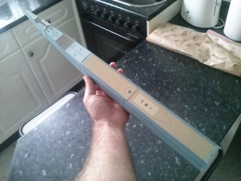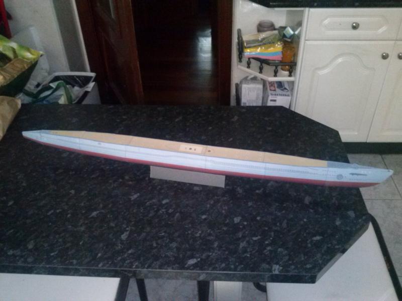 Ayer le dedique un par de horas al submarino y este es el resultado. Termine la parte de la quilla y la pegue. Hice la torre completa, pero la he dejado a la espera de colocarla en su sitio hasta que termine todo el montaje de las hélices y el timon. Es evidente que este modelo es para principiantes pues los detalles son nimios y la complejidad inexistente en comparación al modelo del Akagi, pero aun así queda bien.