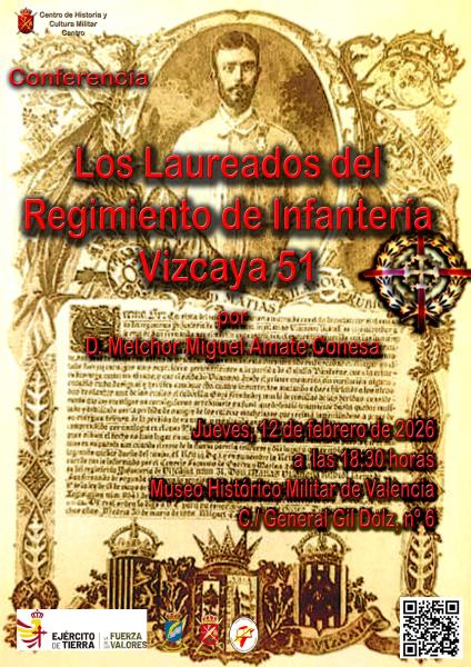 Que anuncia la conferencia, Los Laureados del Regimiento de Infantería Vizcaya 51, que será impartida por Don Melchor Miguel Amate Conesa, comandante de artillería (R), nieto de uno de los Laureados del Vizcaya 51.