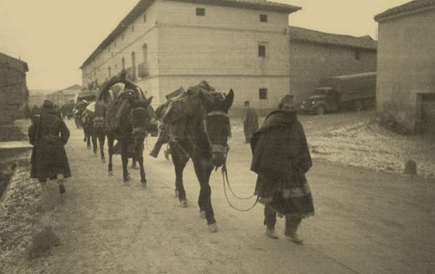 Aqui vemos un acemilero del ejercito creo que republicano con unos machos como les llamamos en mi pueblo que son las crias de un caballo y una mula y son muchisimo mas resistentes , obedientes y corpulentos que las mulas y caballos este lleva 3 y por lo que parece hace un frio que pela